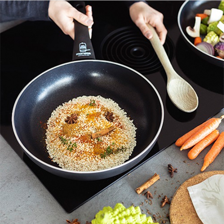 特許を取得したノンスティックコーティングである「PROTECTION BASE」は、従来の3層コーティングの上にマイクロクリスタルを含有したトップコートと摩耗に強い特殊フィルムを重ねた多層構造(5層)になっており「PROTECTION BASE」を使用しない従来品と比較して約2倍の磨耗強度を実現しています。また、人体に悪影響を及ぼすとされるPFOA、BPA、重金属などの化学物質は含まれておりません。