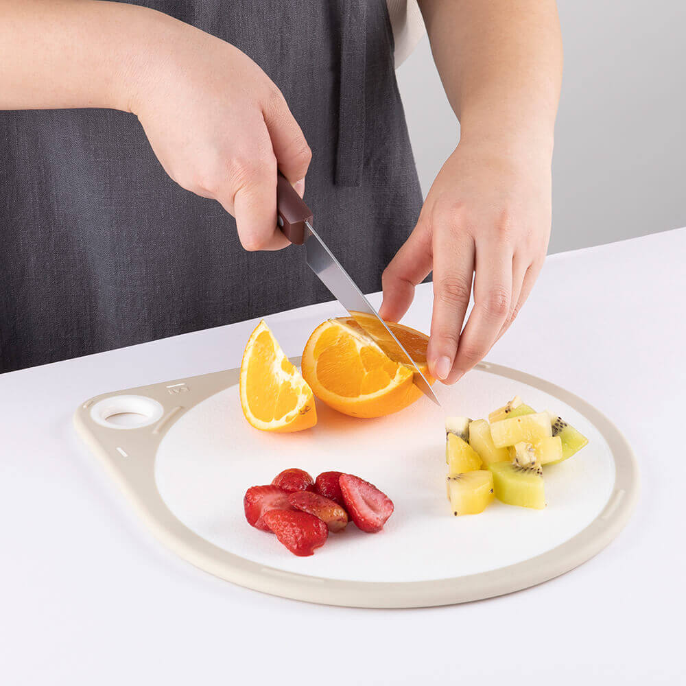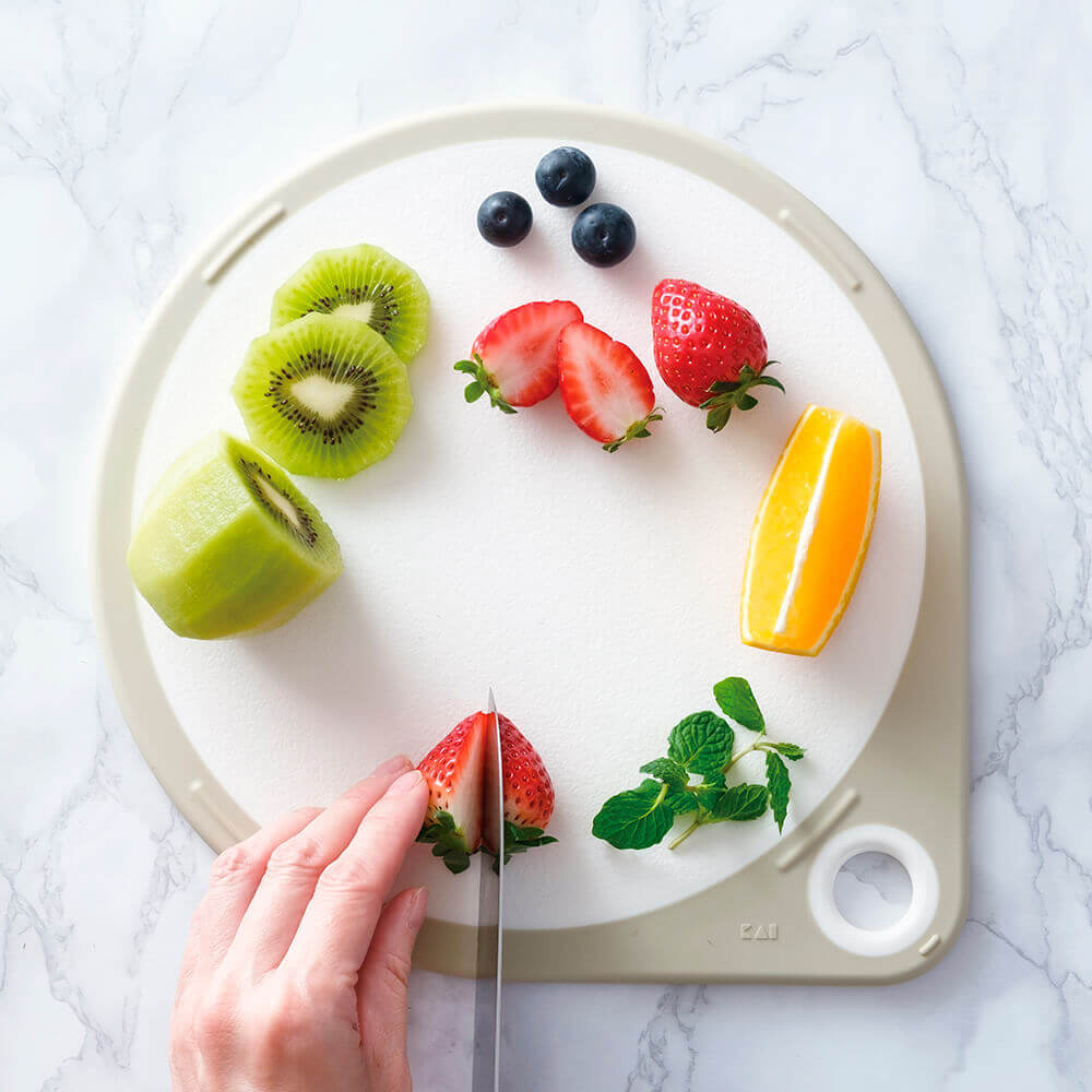 まな板を回転させることで、切った食材を仮置きしたまま使用でき、洗い物も軽減。また直線部分を設けることで転がりにくく倒れにくい、立てかけ収納が可能な形状になっています。