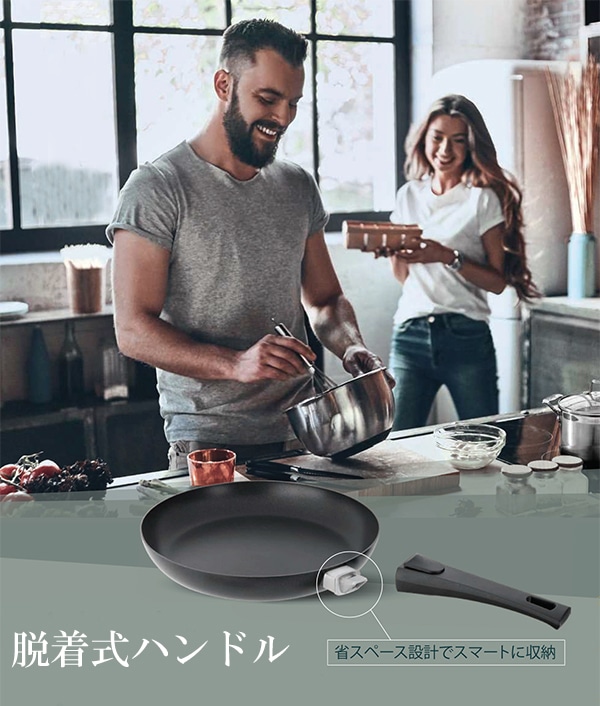 取り外し可能なハンドルで鍋やフライパンをスッキリ収納が可能に。 引き出しやコンロのスペースを有効活用でき、キッチンがもっと使いやすくなります。