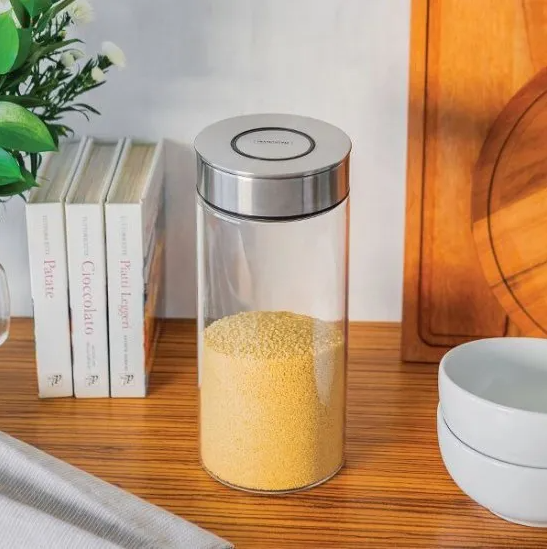 今まで無かったガラス製の密封キャニスターです。樹脂製のものはいままでもご紹介しましたが、この品物はガラス製で衛生的です。傷も付きにくく透明度も高いです。ステンレス蓋がスタイリッシュなガラスキャニスターワンタッチ密閉&開閉式で片手で簡単に蓋を外すことが出来、使いやすい保存容器です。ガラスとステンレス蓋の組み合わせは食材に臭いが付きにくく、豆、穀類、シリアル、パスタ等、湿気を避けたい乾燥食品にもおすすめです。