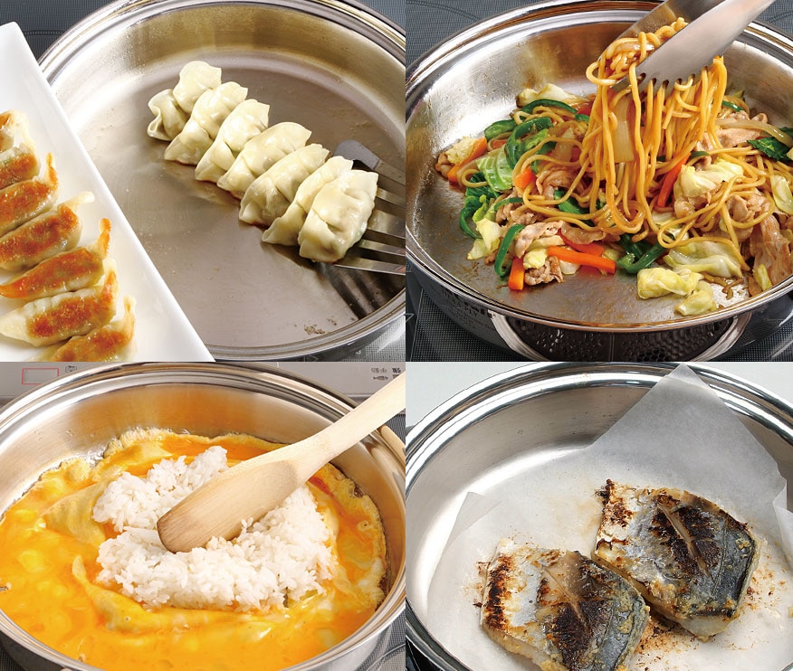 鍋底にあたった熱が、鍋全体に素早く均等に伝わるため、肉や魚などは素材の脂分だけで調理できます。