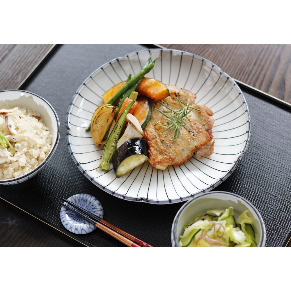 一つ一つ個性のある、手描きによる線模様と、和食器ならではの湾曲した形状が和食を豊かに盛り立てます。
