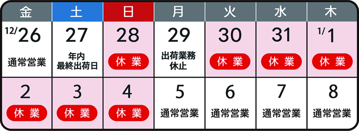 年末年始休業のお知らせ いつも当店をご利用いただきありがとうございます。 誠に勝手ながら、池商は12月30日から2026年1月4日まで年末年始休業とさせていただきます。 また、2025年の出荷業務は12月27日までとなります。 お問い合わせの返信、出荷業務などは1月5日午後より順次行って参ります。 休業中もオンラインショップ、FAXでのご注文は可能ですので是非ご利用くださいませ。 ご不便をおかけ致しますが、何卒ご理解のほどお願い申し上げます。